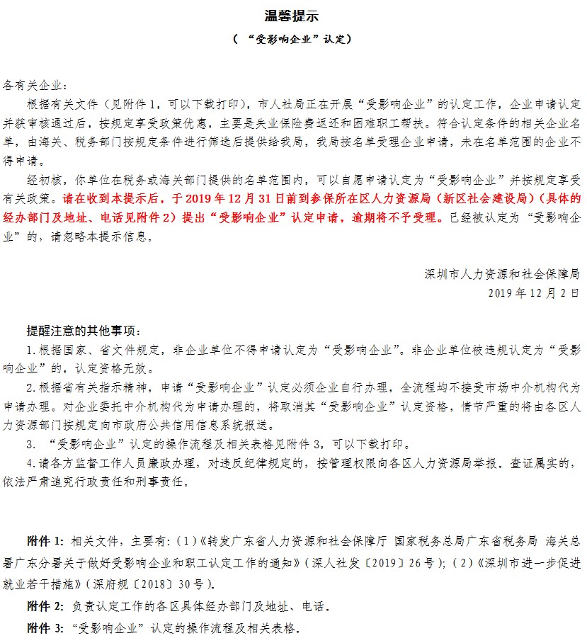 在寶安區(qū)繳納社保并收到本輪彈窗消息的企業(yè),請于2019年12月31日前向注冊地所在街道(受理窗口地址及聯(lián)系電話請查看附件3)提出“受影響企業(yè)”認定申請,逾期將不予受理。認定業(yè)務審批結束后,請自行到區(qū)社保分局辦理返還業(yè)務(區(qū)社保分局失業(yè)科咨詢電話:27881426)。